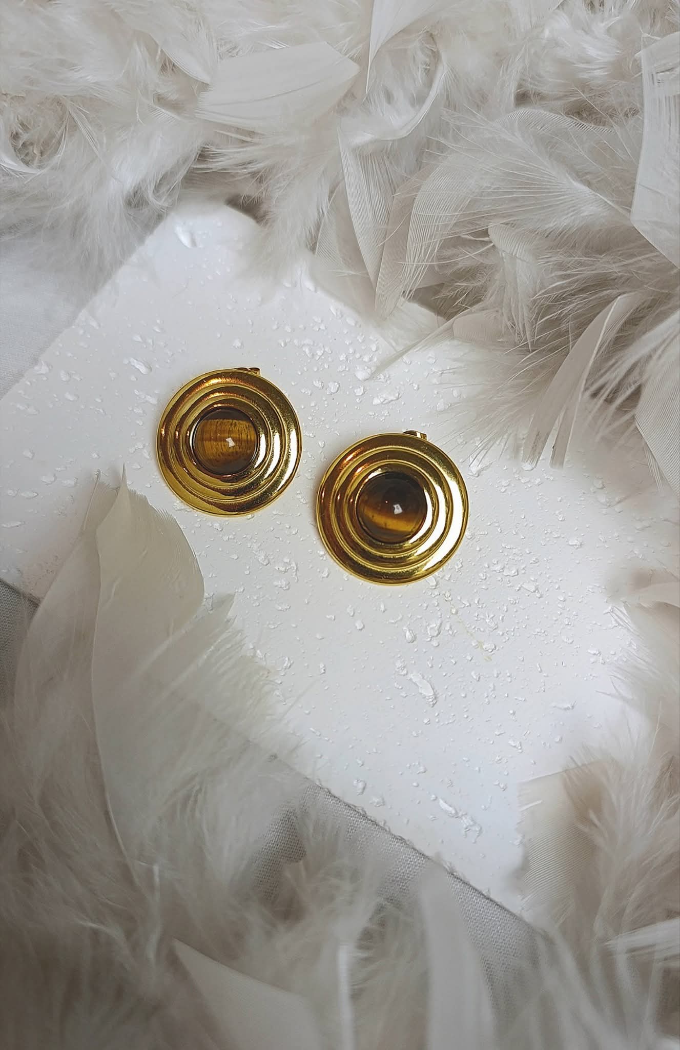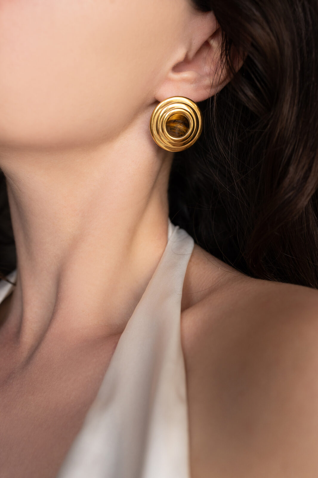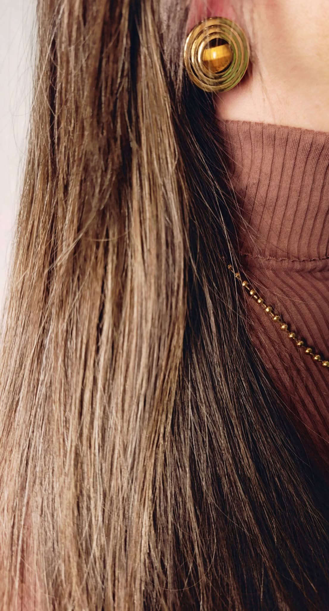 Καρφωτά σκουλαρίκια με μοντέρνο κυκλικό σχεδιασμό και καφέ πέτρα που χαρίζει ζεστό και κομψό αποτέλεσμα. Ένα διαχρονικό κόσμημα που μπορεί να φορεθεί από το πρωί έως το βράδυ.