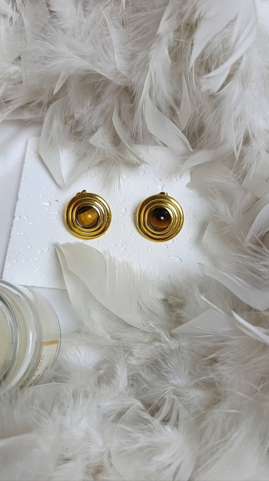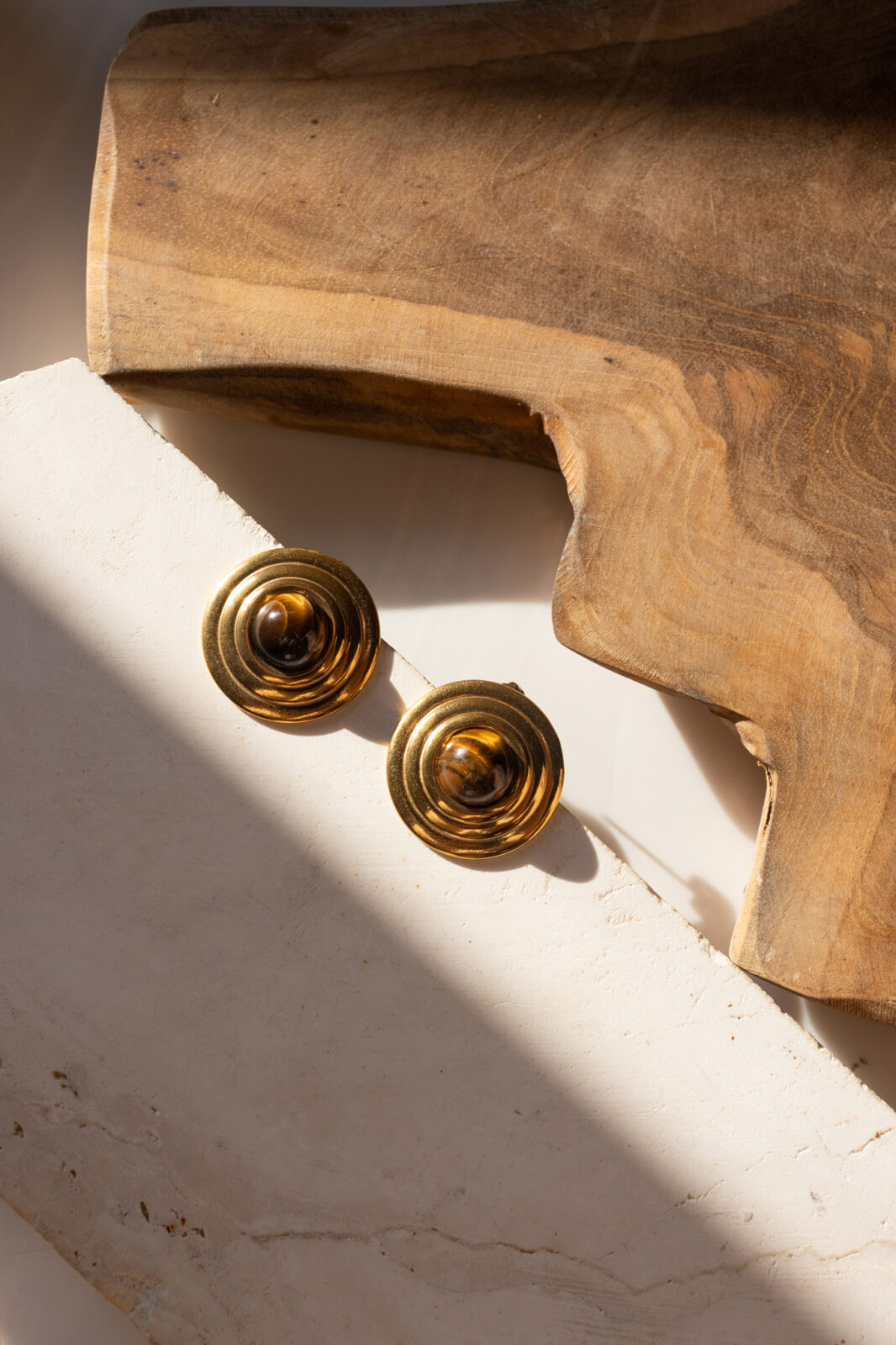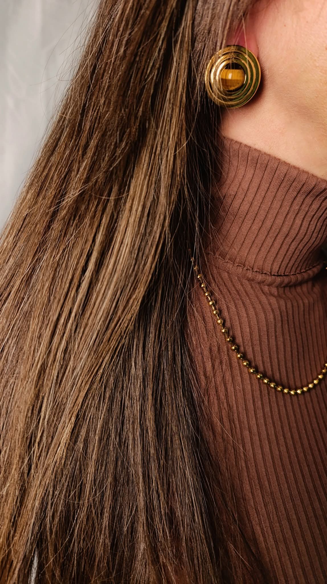 Καρφωτά σκουλαρίκια με μοντέρνο κυκλικό σχεδιασμό και καφέ πέτρα που χαρίζει ζεστό και κομψό αποτέλεσμα. Ένα διαχρονικό κόσμημα που μπορεί να φορεθεί από το πρωί έως το βράδυ.