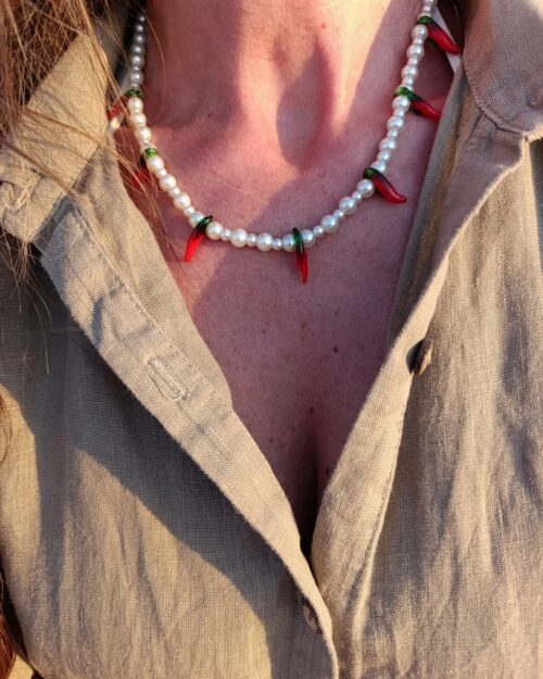 Κολιέ με χάντρες αιματίτη που συνδυάζει μοντέρνα αισθητική με έντονο χαρακτήρα.