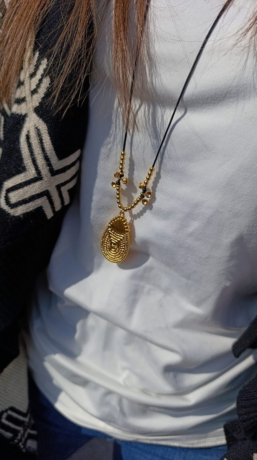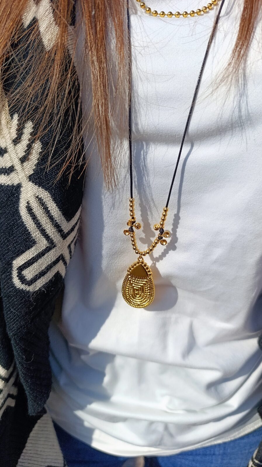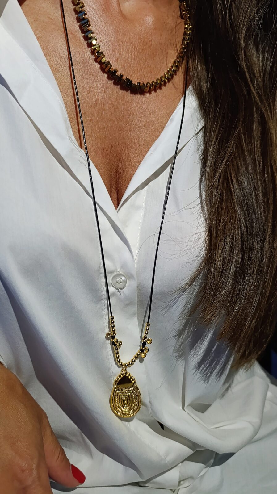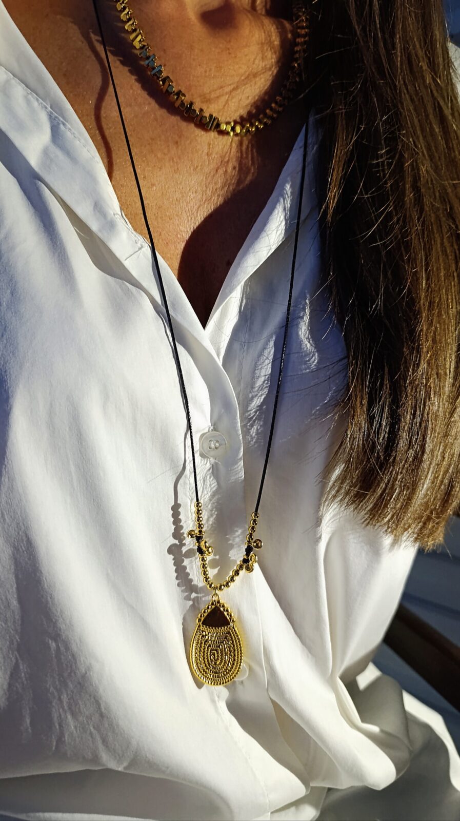 Κολιέ με μαύρο κορδόνι και εντυπωσιακό μεταλλικό μενταγιόν σε σχήμα σταγόνας, σε χρυσό τόνο με λεπτομέρειες σπειροειδούς σχεδίου.