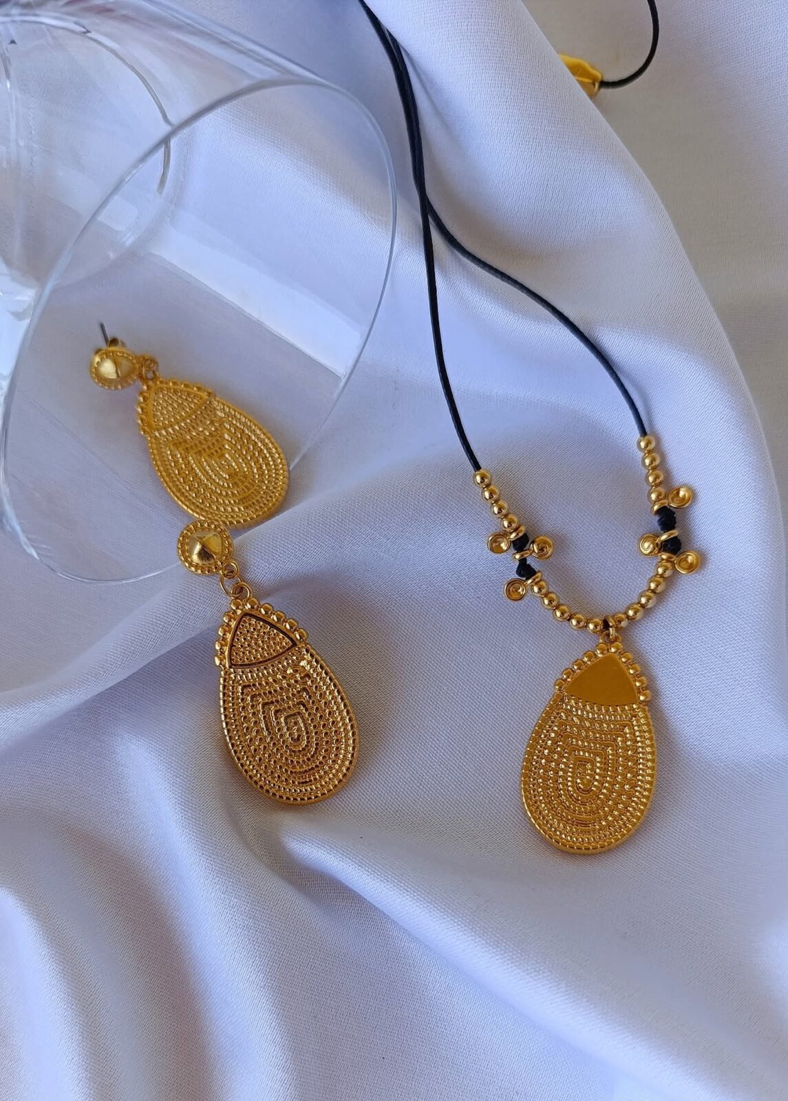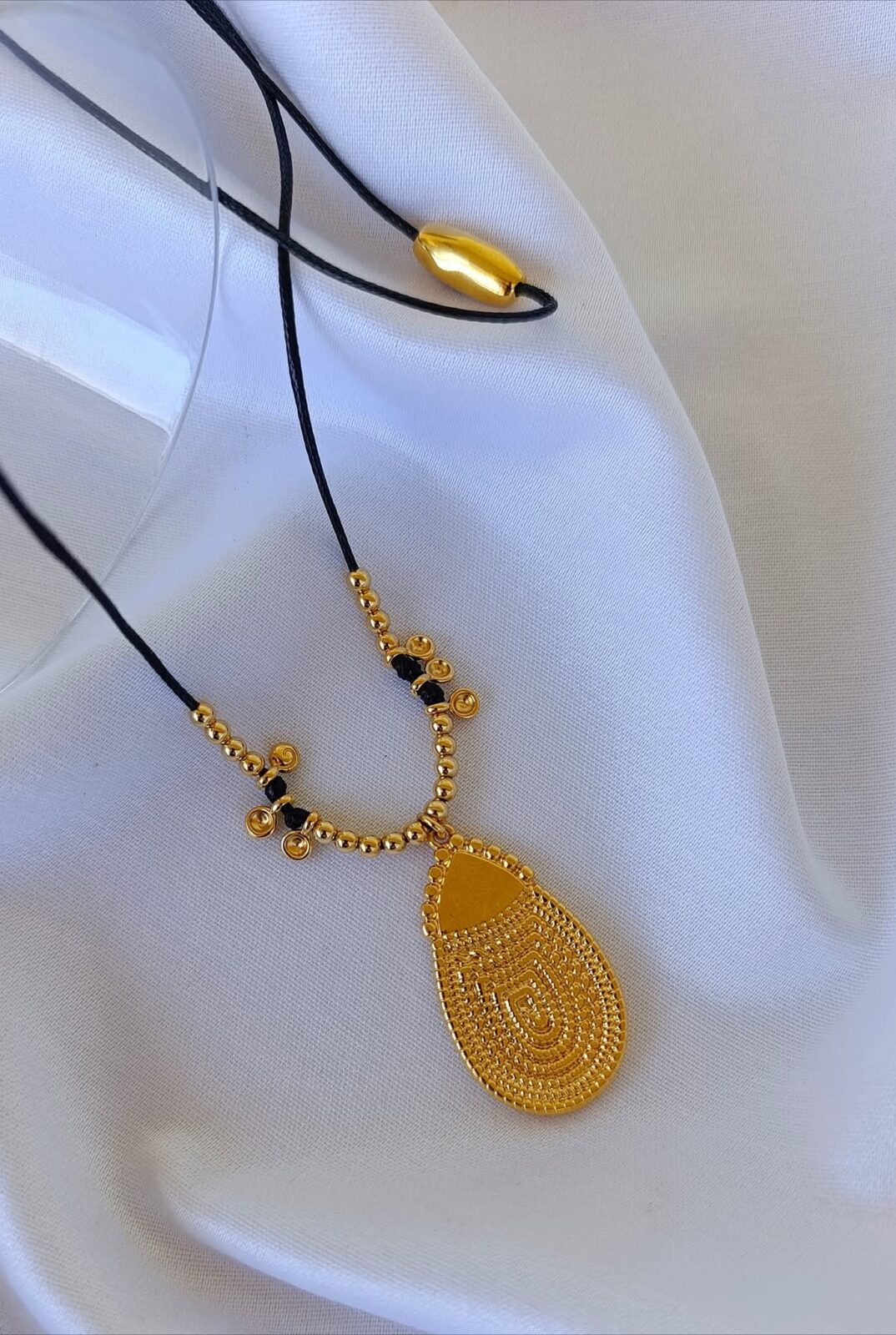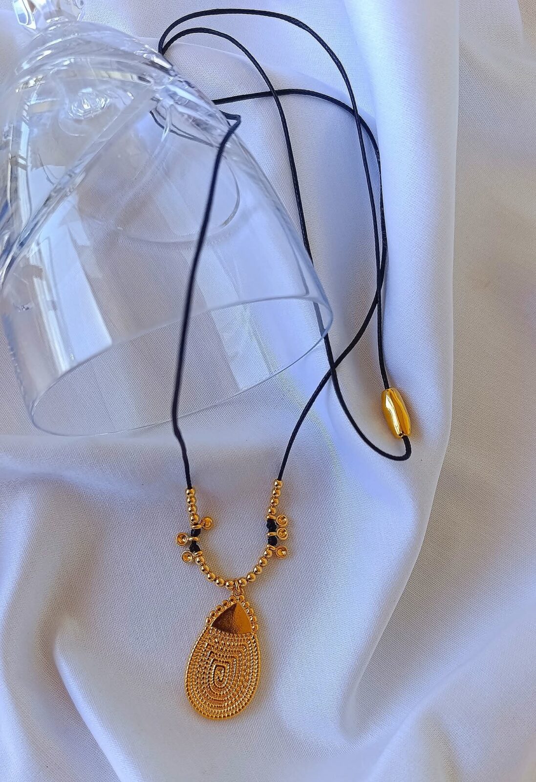 Κολιε με μαυρο κορδονι και χρυσο μεταλλικο μενταγιον σε σταγονα, διακοσμημενο με λεπτο σπειροειδες σχεδιο.