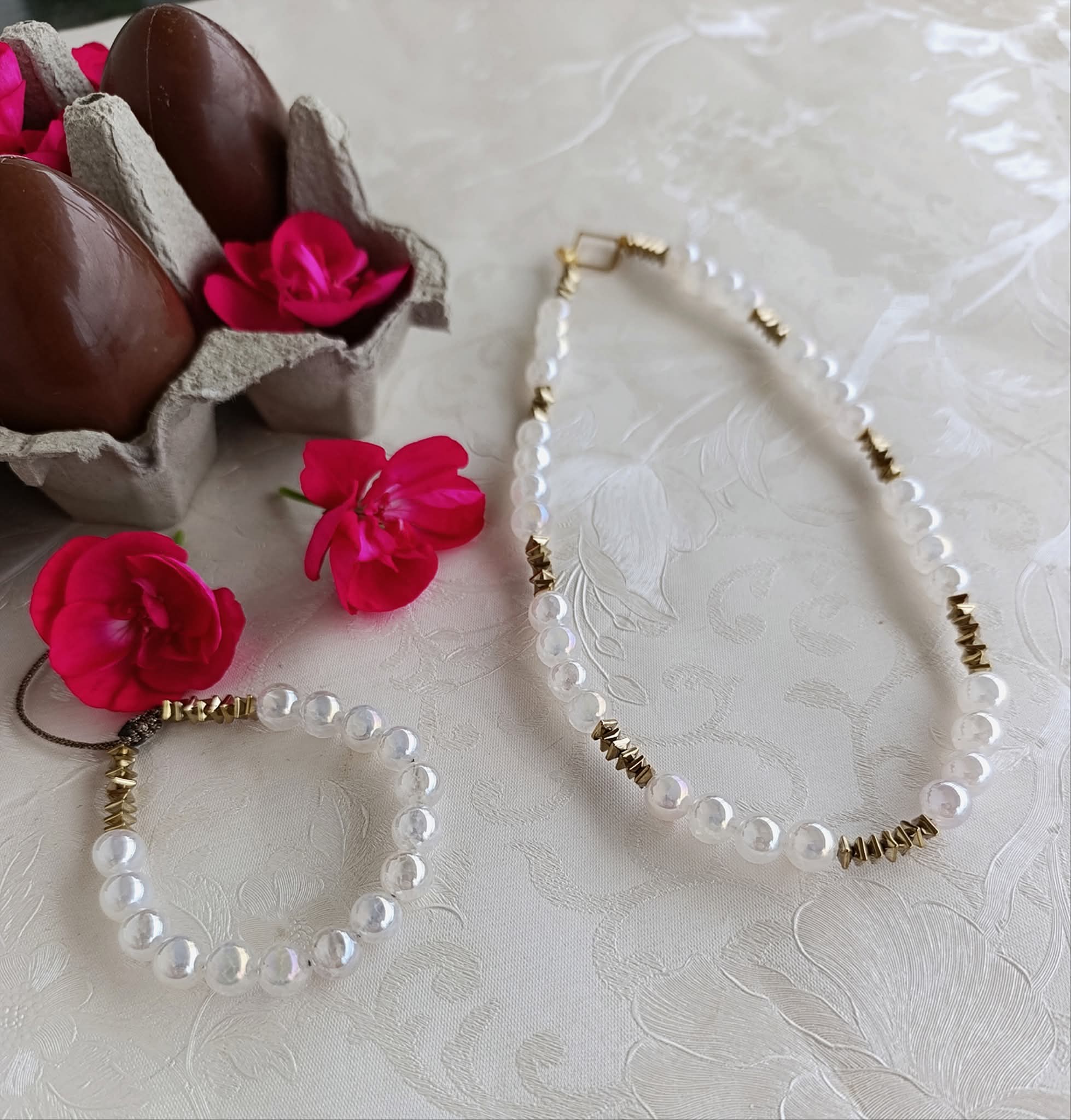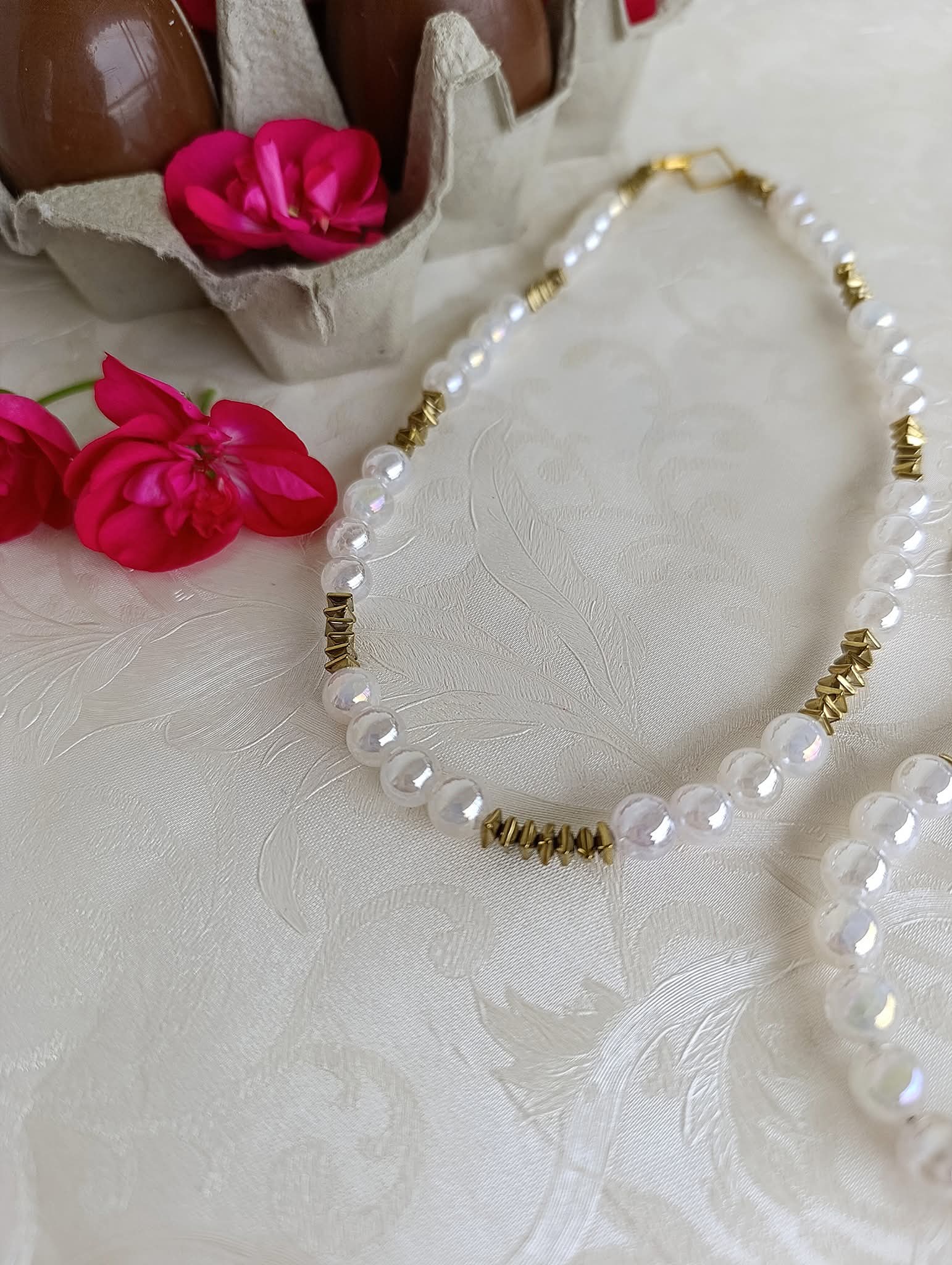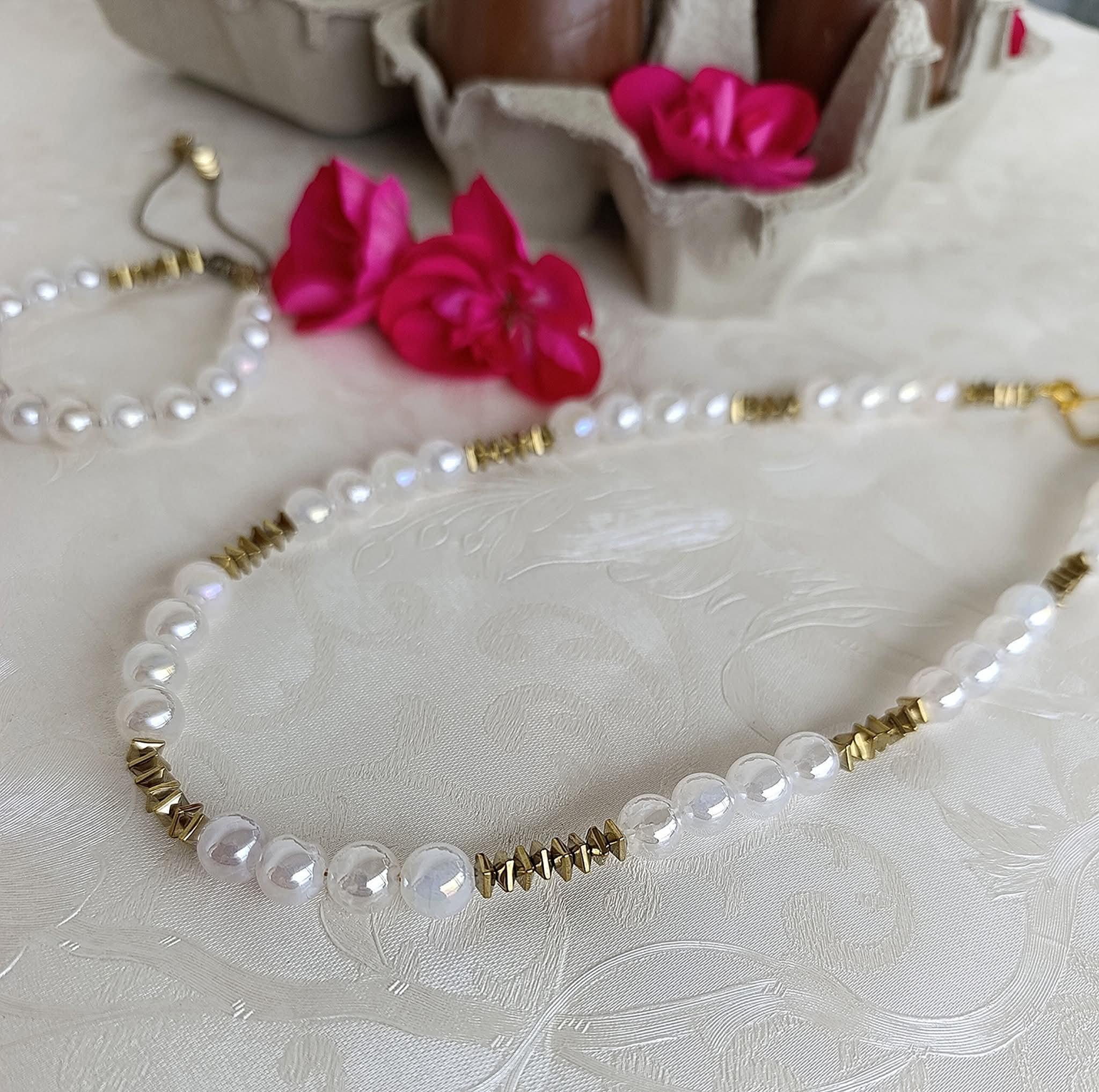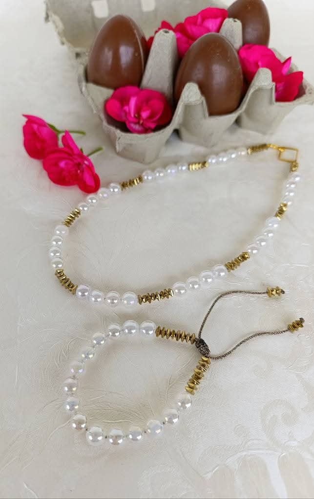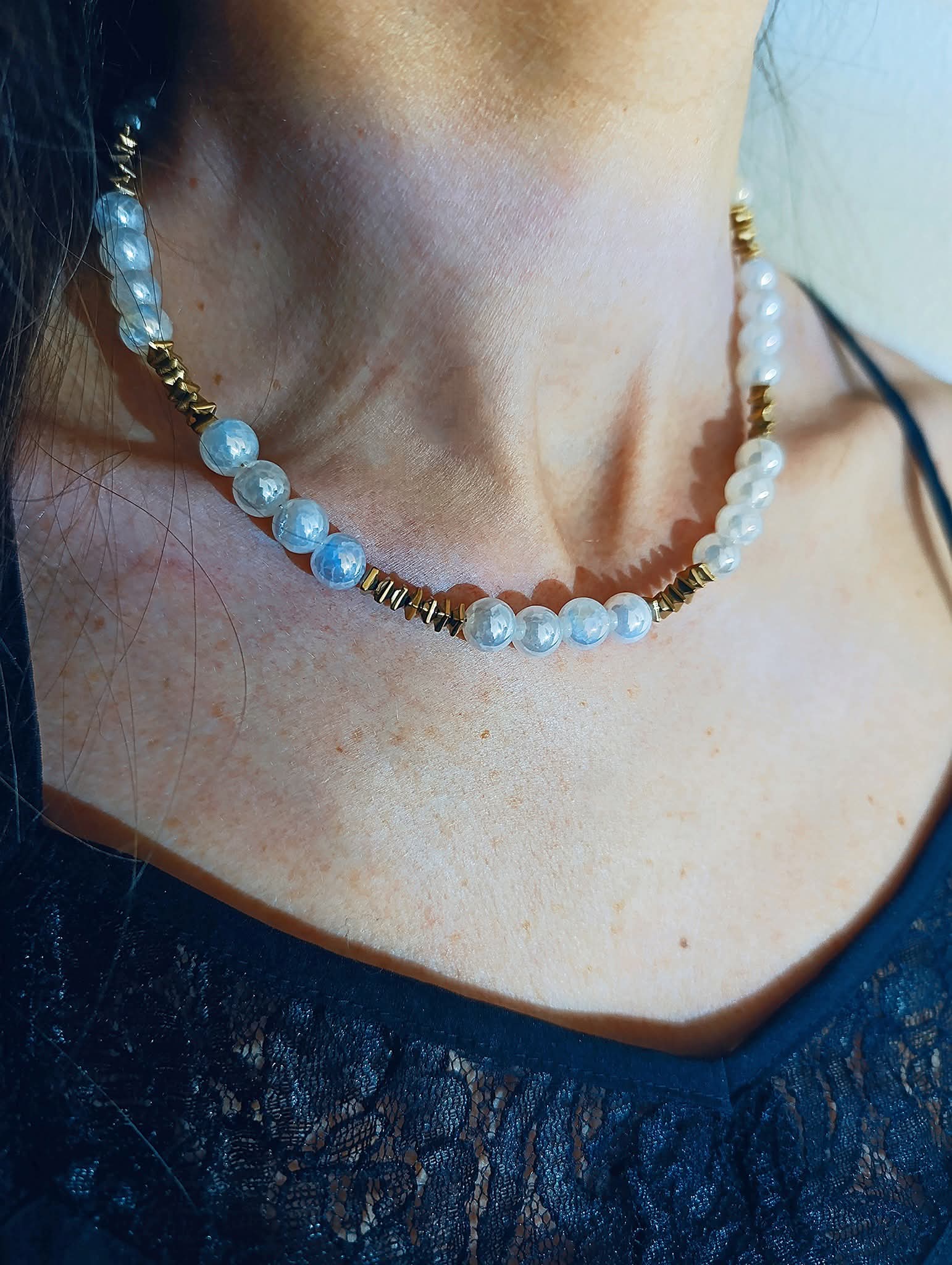 Χειροποίητο κοντό κολιέ με ιριδίζουσες πέτρες λευκού αχάτη και πέτρες χρυσού αιματίτη