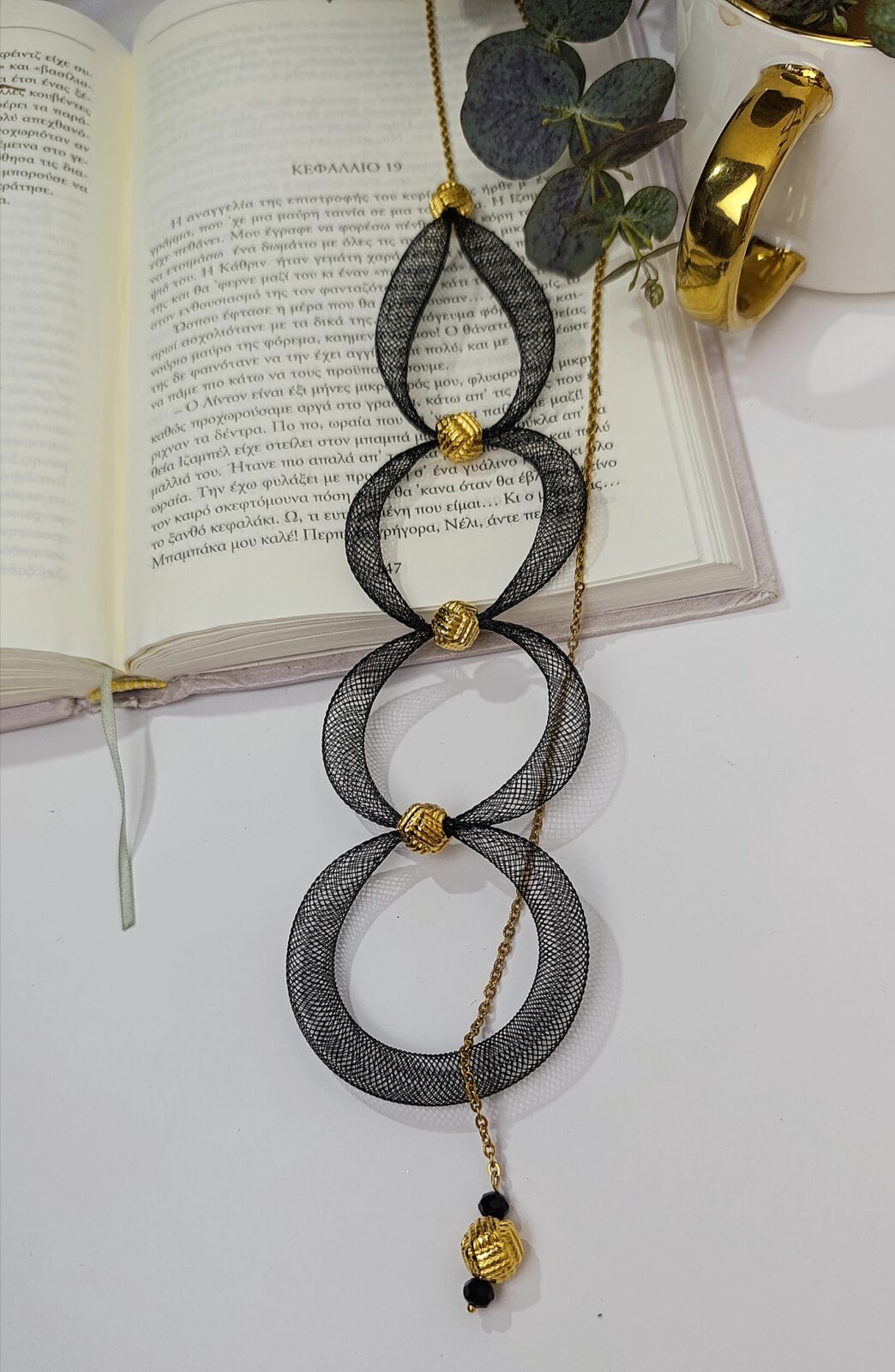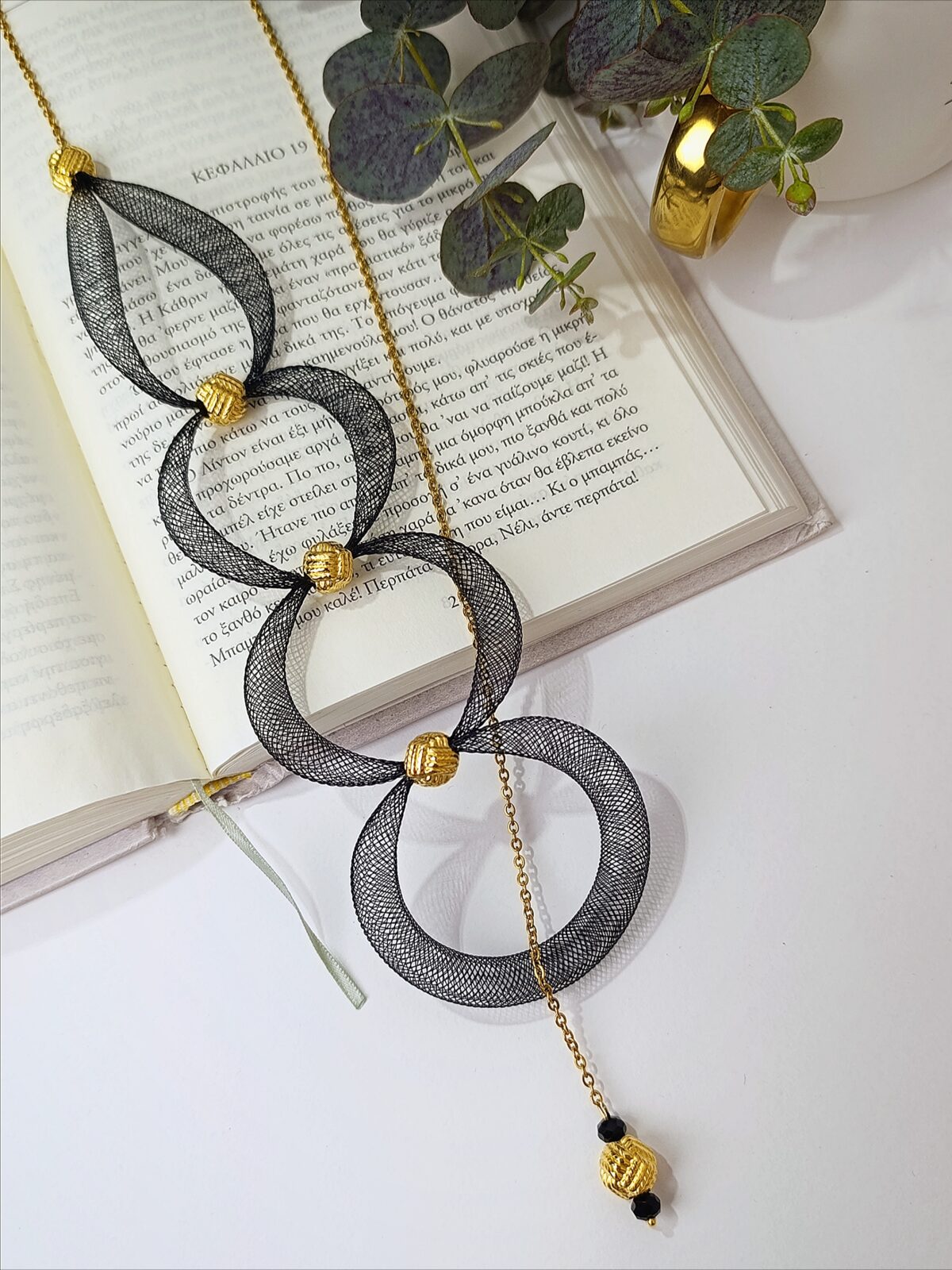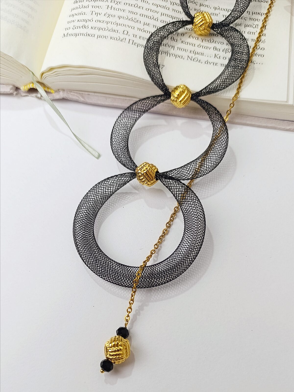 Εντυπωσιακό κολιέ με ιδιαίτερο σχεδιασμό που συνδυάζει καλλιτεχνική αισθητική και σύγχρονο στυλ. Οι μεγάλοι mesh κύκλοι δημιουργούν ένα δυναμικό και αρχιτεκτονικό αποτέλεσμα, ενώ οι χρυσές λεπτομέρειες προσθέτουν μία διακριτική πολυτέλεια.